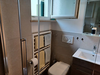 Das kleine moderne Bad (mit Dusche/WC und Fenster) befindet sich zentral zwischen Küche und Wohraum und wird oft auch als Tages-WC genützt.